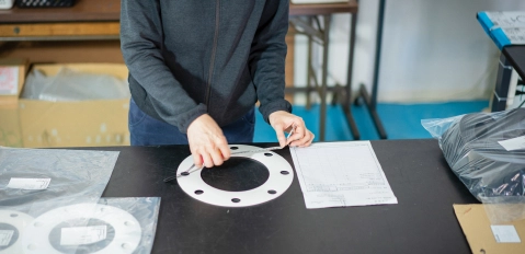 本社工場では、主にガスケットの加工を行っています。各種原反材料を取り揃えることで、短納期でお客様のニーズに応え、あらゆる形状の加工を実現しています。